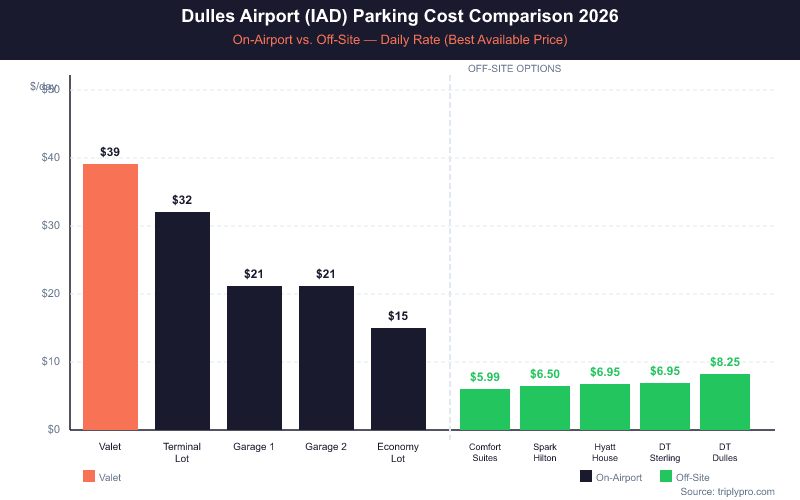 Dulles airport parking deals are discounted rates at Washington Dulles International Airport (IAD) that can cut your daily parking cost from $39/day for valet down to as little as $5.75/day at verified off-site hotel lots — a savings of over 85% compared to on-airport valet. The key is knowing which lots qualify, how far in advance to book, and which platforms offer the lowest guaranteed rates.