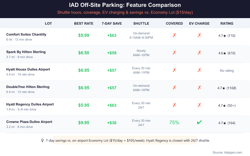 - 7 verified off-site lots near IAD range from $5.99/day to $9.95/day with free shuttle included
