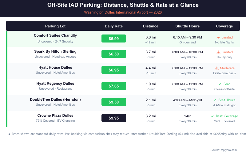 - Cheapest off-site option: Comfort Suites Chantilly at $5.99/day — saves up to 63% vs. the Terminal Lot