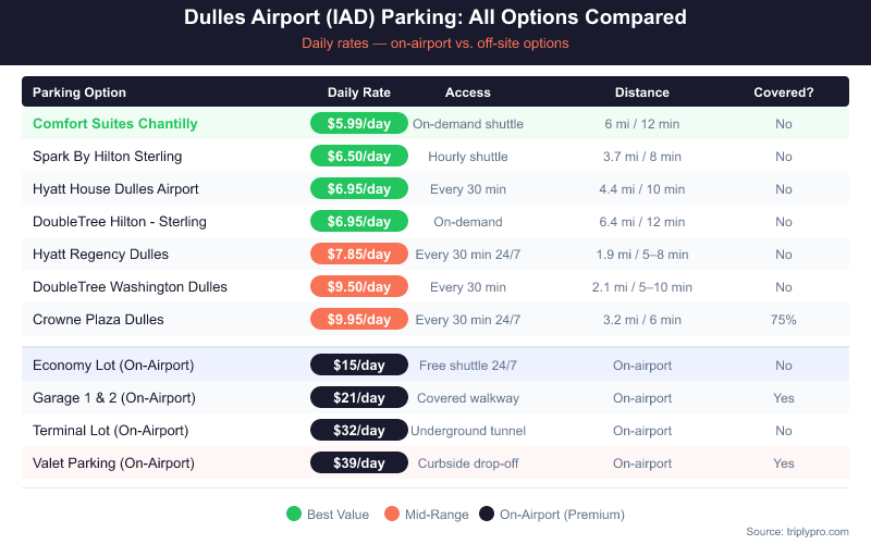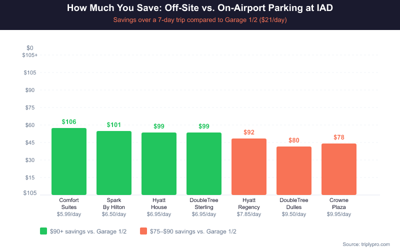 Off-site hotel lots near IAD offer the best combination of low price and reliable shuttle service. Based on current Triply rates, you can save up to 62% vs on-airport Economy Lot pricing by choosing the right off-site option. Here's how the verified lots compare (verified April 2026):