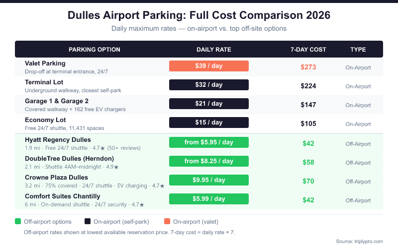 For the full picture of every IAD parking option with real-time rates, compare all Dulles Airport parking options on Triply — from $5.99/day at off-site hotel lots to the on-airport garages at $21/day. Filter by price, shuttle hours, and distance to find the right fit for your trip.