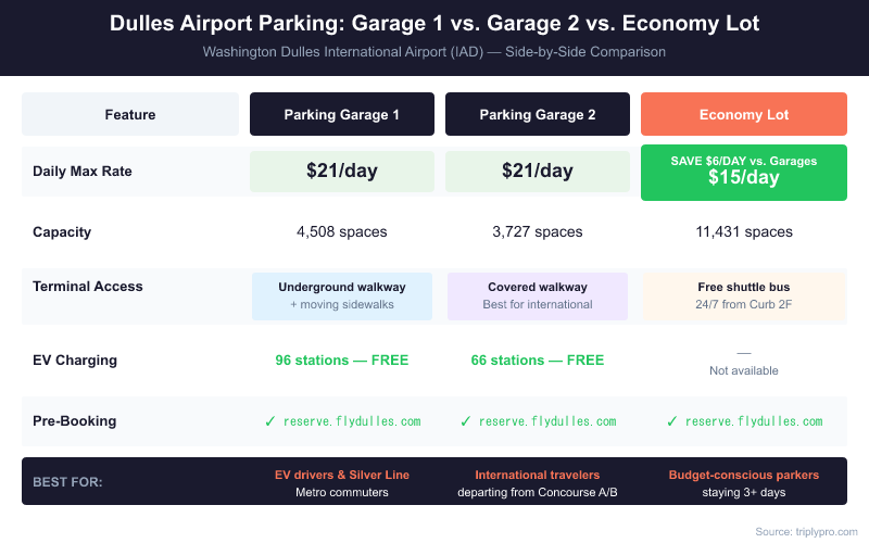 Choose Garage 1 if you want covered parking with a fast walk to the terminal and no shuttle wait. It is also the best choice if you plan to use the Silver Line Metro. Choose Garage 2 if you are flying internationally — per MWAA, Garage 2's covered walkway is noted as most convenient for international destinations. For more on Garage 2 specifically, see our guide to Dulles Parking Garage 2 rates and directions. Choose the Economy Lot if you are staying more than three days and do not mind the shuttle ride — at $15/day flat, a week in the Economy Lot costs $105 versus $147 in Garage 1.