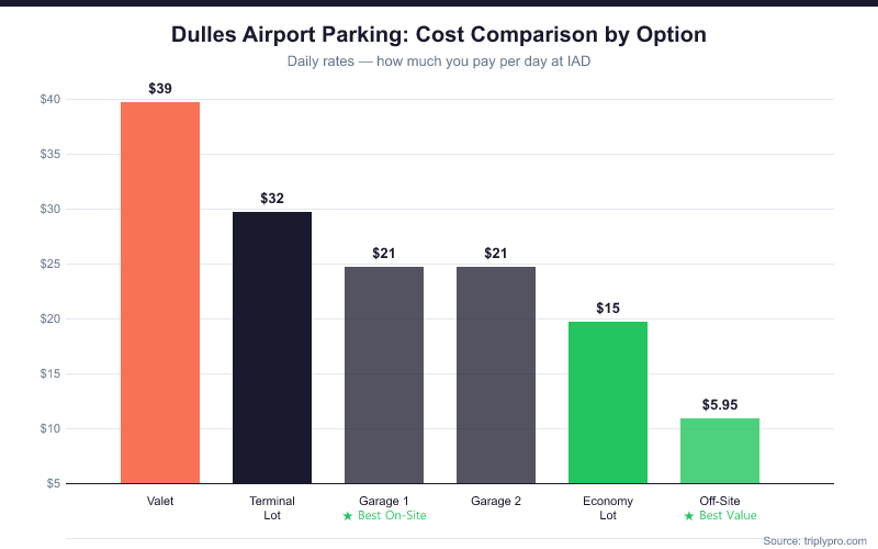 Ready to find the best IAD parking deal? Compare Dulles Airport parking options side-by-side on Triply — including Garage 1 and off-site lots from $5.75/day.