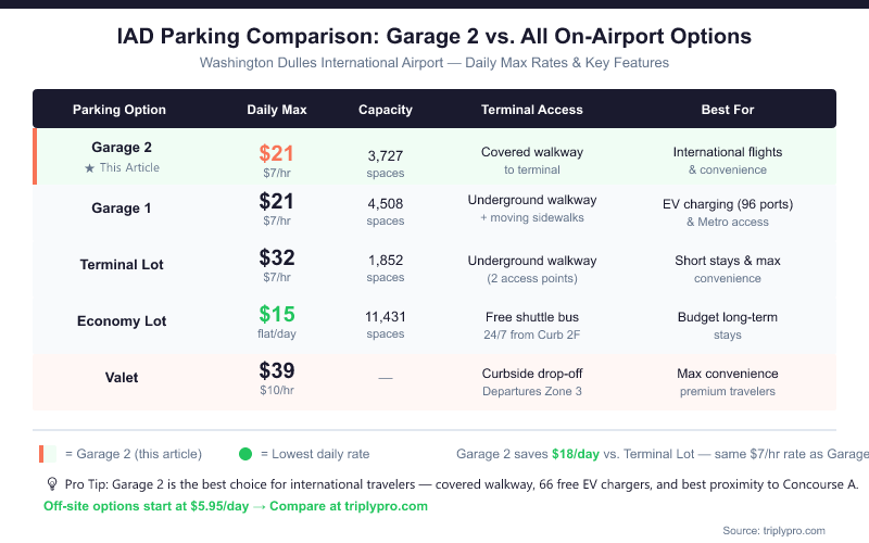 Ready to lock in your IAD parking rate? Compare Dulles Airport Garage 2 and off-site lots starting from $5.99/day on Triply — side-by-side, with free cancellation.