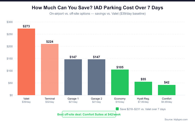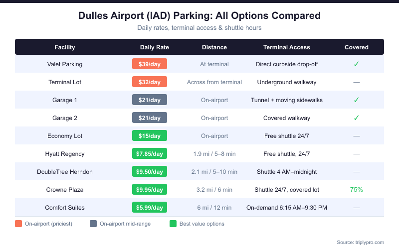 Off-site hotel parking near IAD starts at $5.99/day — roughly 71% cheaper than Garage 1 or Garage 2. All seven verified off-site lots include free shuttle service to the terminal. Here's how the top options compare (verified April 2026):