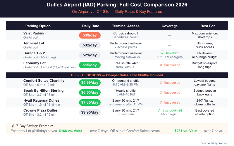 Off-site hotel lots offer significantly lower rates. Based on current Triply-verified pricing, the seven nearby hotel lots range from $5.99/day to $9.95/day — that's up to 62% less than the Terminal Lot. For a full breakdown of every rate across every provider, the Dulles airport parking rates comparison covers all current options in detail. Pre-booking on-airport through reserve.flydulles.com is recommended to secure your space, especially during summer and holiday periods.