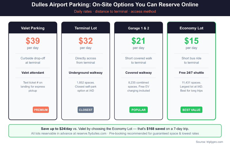 For off-site options, prices run $5.99–$9.95/day based on current Triply-listed rates. These lots are not bookable through reserve.flydulles.com. You book them directly or through a parking comparison platform. See our complete Dulles Airport parking rates comparison for a full breakdown of every option.