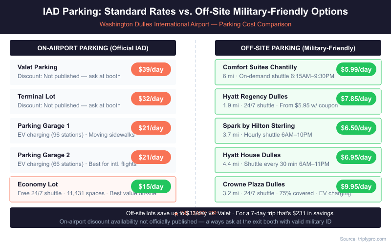- No formal MWAA military discount: IAD's official parking operator does not advertise a dedicated military rate as of April 2026 (verified April 2026).