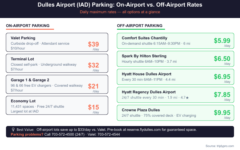 Ready to compare IAD parking before you go? Browse Dulles Airport parking options — including off-site lots from $5.99/day — on Triply.
