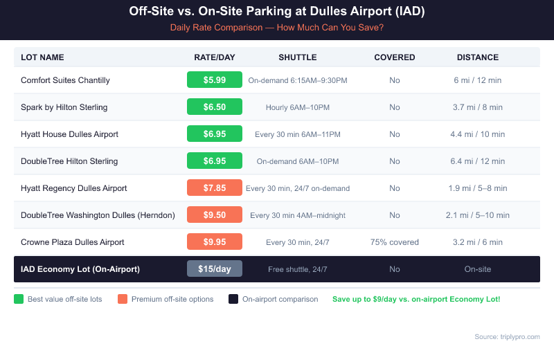 - Cheapest off-site option: Comfort Suites Chantilly at $5.99/day — saves $9/day vs. Economy Lot