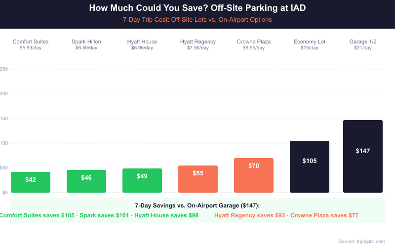 For a 7-day trip, parking at the Comfort Suites Chantilly - Dulles Airport would cost around $42. The same week at the IAD Terminal Lot would cost $224. That's a saving of over $180 for one trip. Even compared to the on-airport Economy Lot at $15/day ($105/week), off-site lots still save you $60 or more.