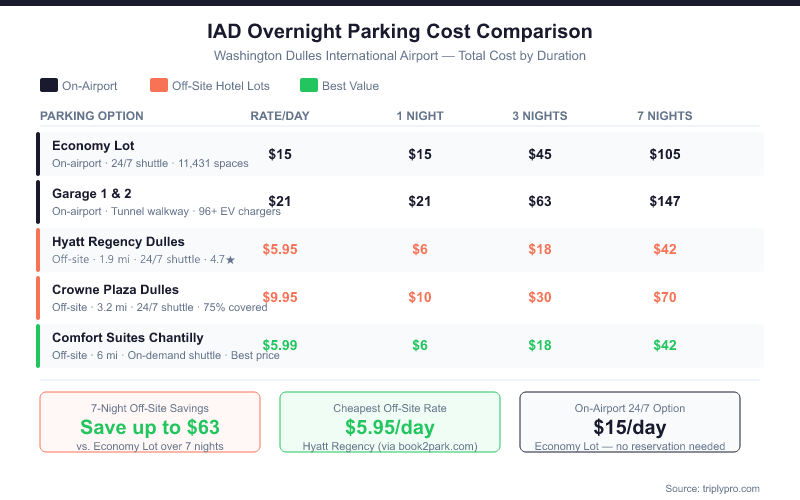 - Book off-site lots through Triply's IAD parking search or directly with the hotel. Some hotels offer lower rates via third-party booking platforms (e.g., Hyatt Regency from $5.75/day via onestopparking.com).