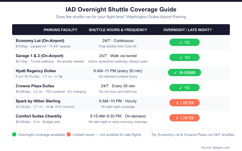 If your flight departs before 6 AM or arrives after 11 PM, choose on-airport parking, the Crowne Plaza lot, or the Hyatt Regency — these are the only options with guaranteed overnight shuttle access. For full details on how every IAD shuttle works, the Dulles Airport Parking Bus guide has routes, pickup locations, and real traveler tips.