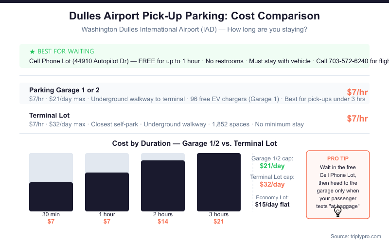 Learn the best parking options for pick-up at Dulles Airport (IAD), from the free Cell Phone Lot to Garage 1 and 2 at $7/hour. Step-by-step tips for smooth arrivals.