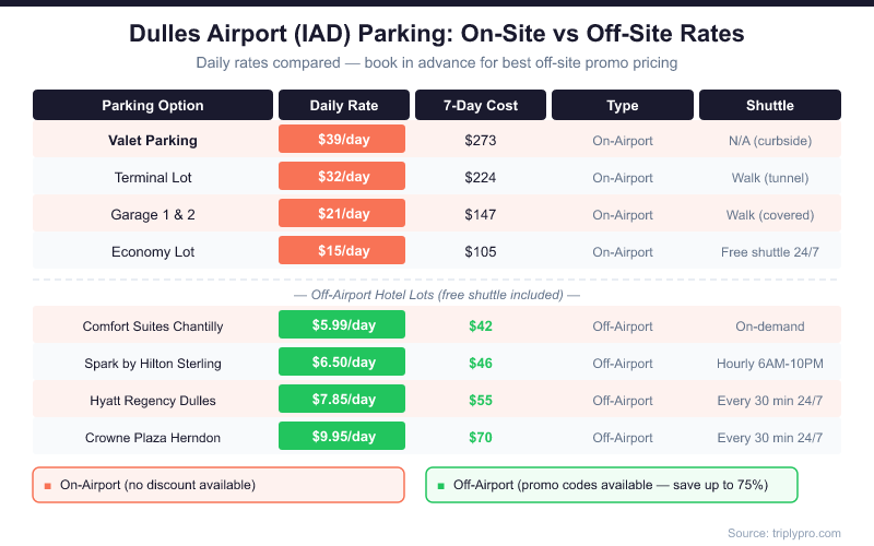 On-airport rates at IAD are set by MWAA and do not accept third-party promo codes. Off-site rates vary by platform and booking date. The table below shows real lot names and verified pricing (April 2026).