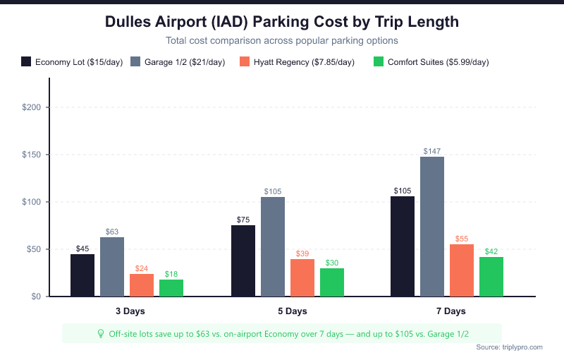 On a 7-day trip, parking at the Comfort Suites Chantilly saves you $63 vs. the Economy Lot and $105 vs. Garage 1. The savings are substantial enough that even adding an Uber home from an off-hours flight would still leave you ahead. For a deep dive on extended stays, read our guide to Dulles Airport long-term parking rates and tips.