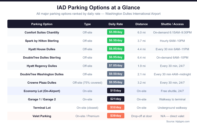 All on-airport rates are per the official Dulles Airport parking page. Off-site rates are based on current Triply data (verified April 2026) and may vary by booking platform.