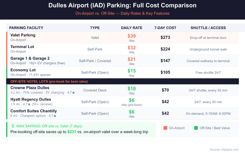- Use a comparison tool like Triply's IAD parking search to see all available lots with live pricing.