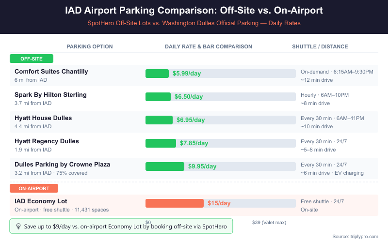 The savings add up fast on longer trips. A 7-day trip parked at Comfort Suites Chantilly costs around $41.93 total versus $105 at the Economy Lot — a saving of over 60%. For a detailed breakdown of all on-airport rates, see our guide to Dulles Airport parking rates.