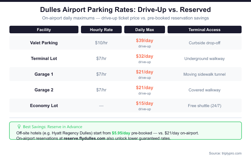 - Garage 1 and Garage 2: Pre-booking at reserve.flydulles.com can lock in rates at or below the $21/day drive-up maximum. During busy periods when lots are nearly full, drive-up spaces may not be available at all.