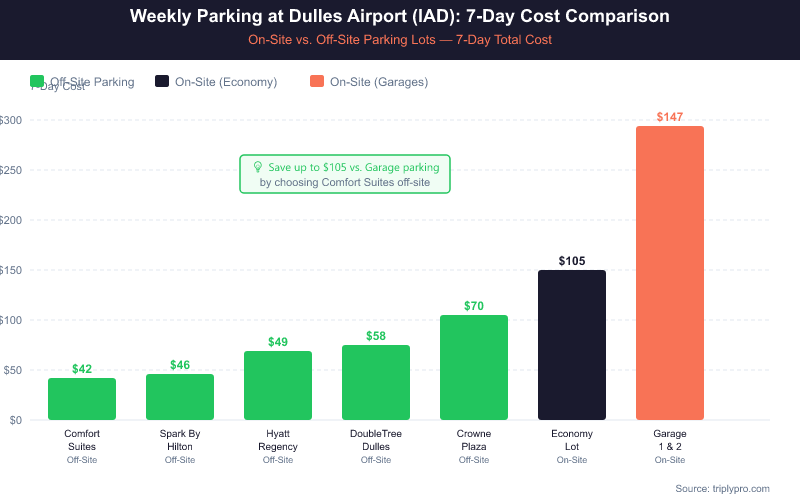 The math is striking. Parking at Comfort Suites Chantilly for a week costs $41.93. Parking in IAD's Terminal Lot for the same week costs $224 — that is over $180 more for seven days. Even the on-site Economy Lot at $105/week costs more than double the cheapest off-site option.