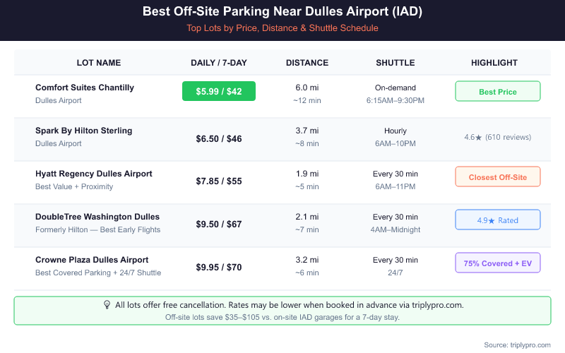 - Best covered off-site option: Dulles Airport Parking by Crowne Plaza at $9.95/day with 24/7 shuttle every 30 minutes.