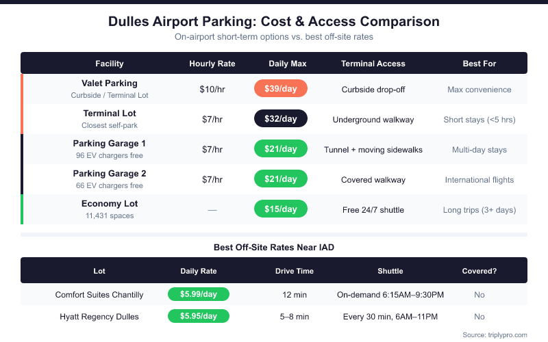 For more detail on off-site options, including how hotel park-and-fly shuttles compare, see our guide on Dulles Airport parking hotel deals.
