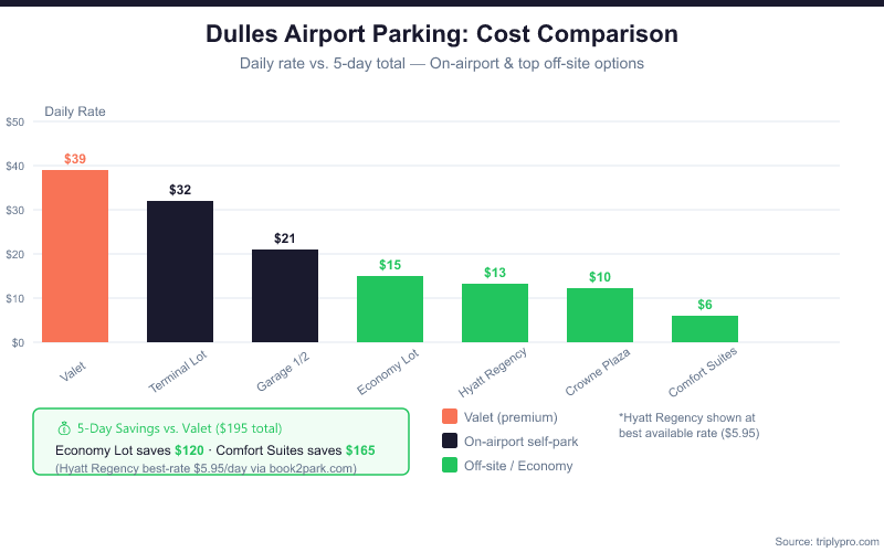 Off-airport hotel lots near IAD start at just $5.99/day at Comfort Suites Chantilly and range up to $9.95/day at Dulles Airport Parking by Crowne Plaza. That's up to 85% cheaper than valet. Most include free shuttle service. The Crowne Plaza lot offers 24/7 shuttle service every 30 minutes, covered parking, and EV charging — none of which come with the on-airport valet option. For longer trips, off-airport parking almost always wins on price. Our article on Dulles Airport hotel parking and park-and-fly deals covers all seven verified lots with current rates and shuttle schedules.