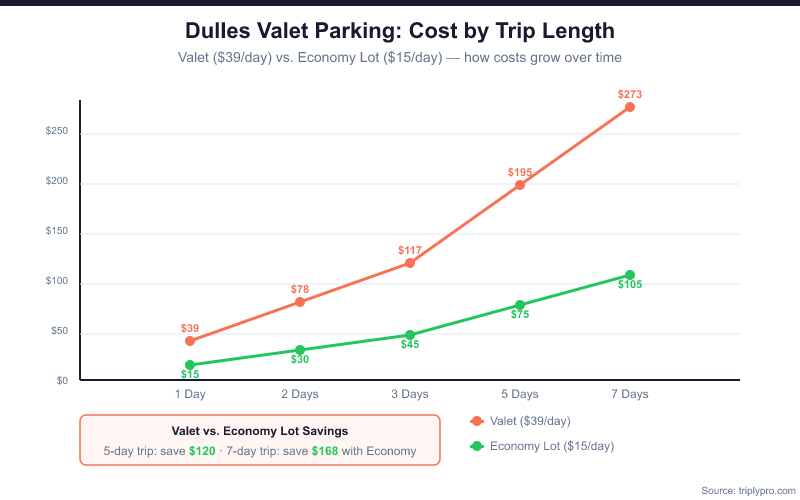 At $39/day, valet is $24/day more expensive than Garage 1 or Garage 2 ($21/day) and $24/day more than the Economy Lot ($15/day). For a week-long trip, that difference adds up fast. If you're focused on cost, our guide to Dulles Airport parking rates across every option breaks down exactly how much you'll spend at each lot. Payment methods include all major credit cards and cash. Dulles Airport's valet page does not currently confirm Apple Pay or digital wallets — bring a card or cash to be safe.