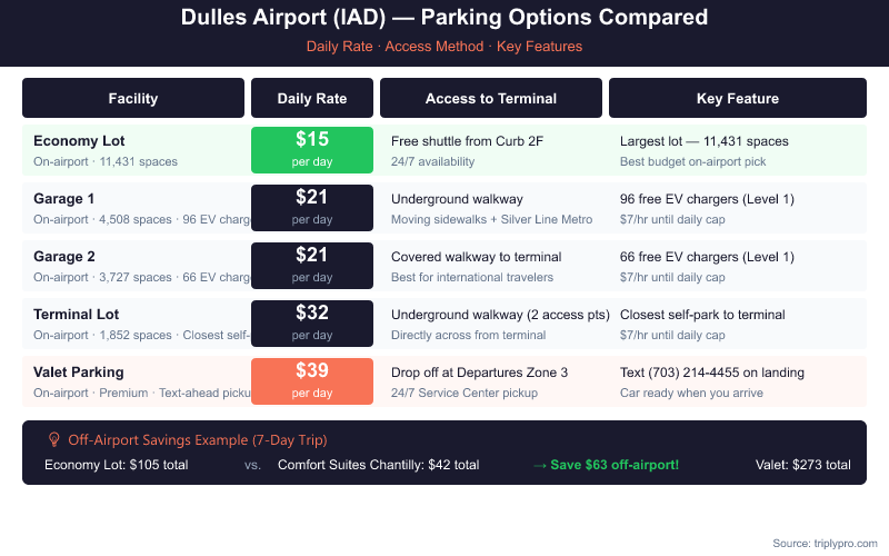 Dulles International Airport daily parking ranges from $15/day at the Economy Lot to $39/day for valet. Off-airport hotel lots start at $5.75/day with free shuttles.