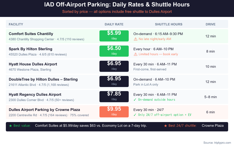 Off-airport hotel lots near IAD can save you up to 62% compared to on-airport daily rates. The trade-off is a short shuttle ride — typically 5 to 12 minutes. Here's how the verified off-airport options stack up against on-airport rates (verified April 2026):