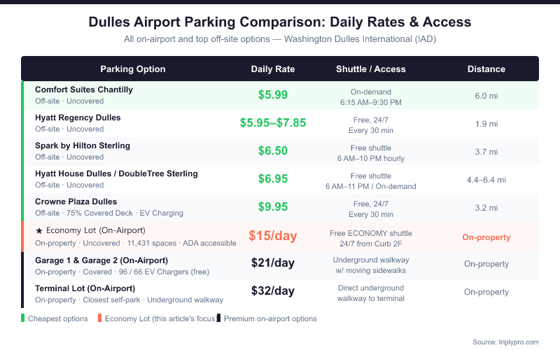 For a full breakdown of all Dulles pricing tiers, see the Dulles airport parking rates guide, which covers every lot and discount option in detail.