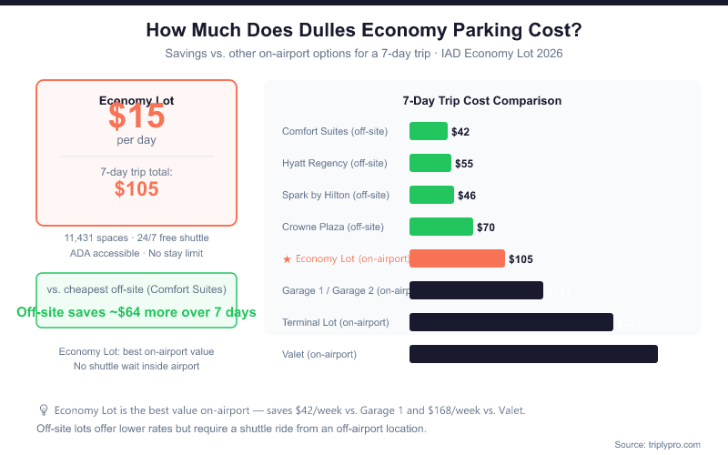 Economy parking at $15/day is the cheapest option MWAA offers on airport property. But several hotel lots near IAD cost significantly less — some by more than half. Here's a direct comparison using verified current rates: