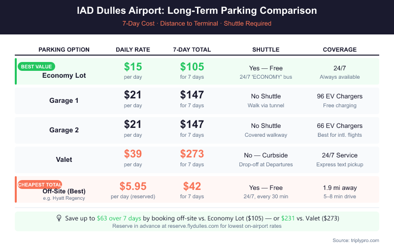 A 7-day trip in the Economy Lot costs $105 total. The same trip at the Hyatt Regency lot (booked via onestopparking.com) starts at just $40.25 — a savings of nearly $65 for one week. For longer international trips, that gap grows fast. For a full breakdown of how daily rates add up across trip lengths, see our guide to IAD long-term parking costs.