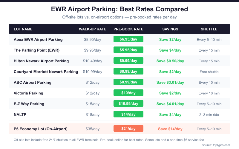 - The Parking Point (EWR) — pre-book online from $5.95/day vs the standard $9.95/day walk-up rate