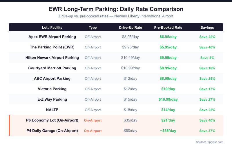 The EWR long term parking cost per day varies widely across on-airport and off-site options. On-airport, the P6 Economy Lot is the most affordable at $35/day drive-up or $21/day pre-booked (verified April 2026). The P4 Daily Garage runs $60/day drive-up or around $38/day pre-booked. Off-site lots near EWR undercut those prices significantly — ranging from $8.95 to $18/day across eight verified providers.