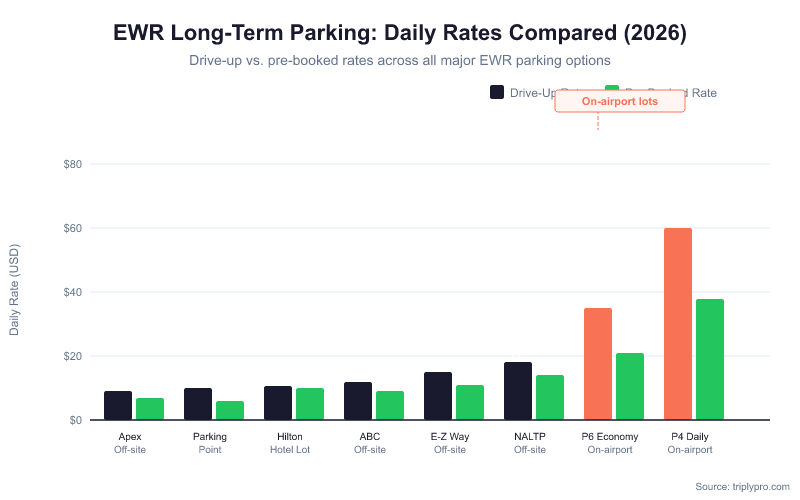 - Cheapest off-site option: Apex EWR Airport Parking at $8.95/day (verified April 2026)