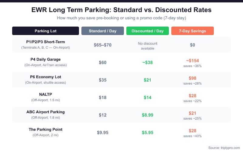 | P6 Economy Lot (on-airport) | $35/day (drive-up) | $21/day | Pre-book at newarkairport.com (saves ~28%) |