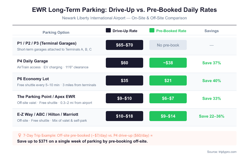 - Pre-booking saves 28–36% on official EWR lots, per Port Authority of New York and New Jersey rates.