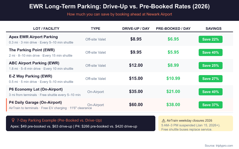 The cheapest off-site options start at $8.95/day at Apex EWR Airport Parking. On-airport, the P6 Economy Lot drops from $35/day to just $21/day when pre-booked — a savings of roughly 40%. With so many lots to choose from and major AirTrain construction affecting service throughout 2026, comparing your options before you go is more important than ever.