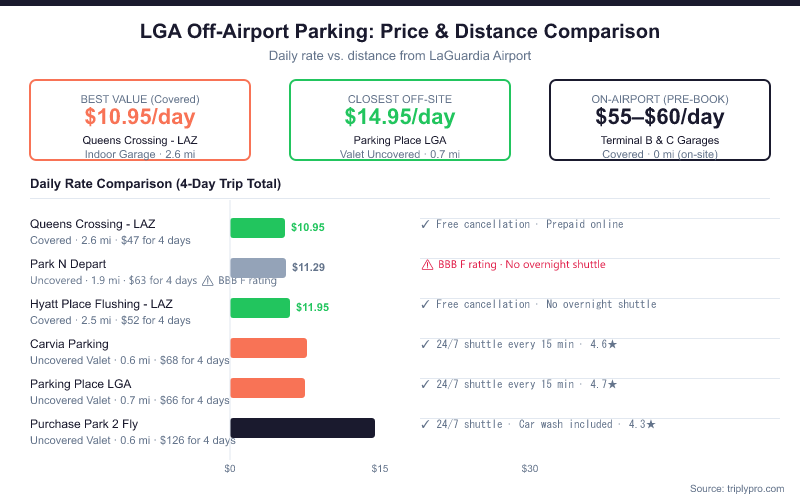 Ready to lock in your LGA parking spot? Compare covered valet and off-site LGA parking options from $10.95/day on Triply — with shuttle details, cancellation policies, and verified rates side by side.
