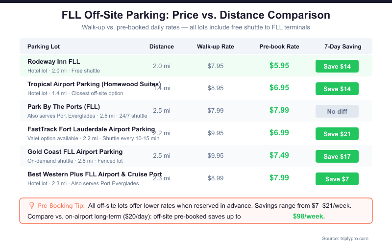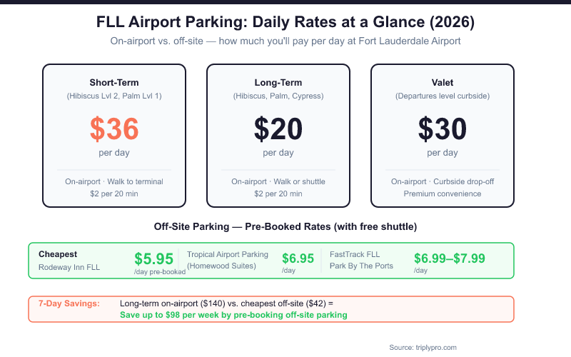 Before you book, review the FLL official parking page to confirm current on-airport rates alongside your off-site options.
