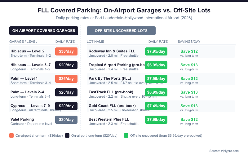 - Off-site lots near FLL are uncovered — if covered parking matters to you, on-airport garages are your only guaranteed option.