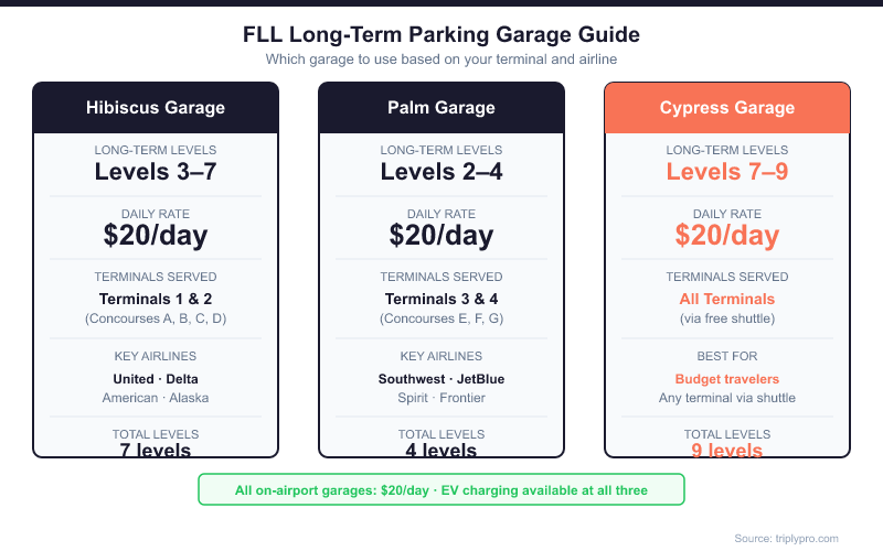 The FLL long-term parking map covers three on-airport garages — Hibiscus, Palm, and Cypress — at $20/day, plus off-airport lots from $7.95/day. Learn which levels and garages serve your terminal.