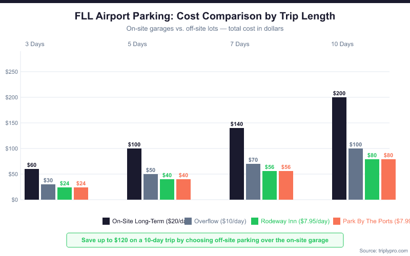 | Trip Length | FLL Long-Term Garage ($20/day) | FLL Overflow ($10/day) | Off-Site Lot — Rodeway Inn ($7.95/day) | Off-Site Lot — Park By The Ports ($7.99/day) |