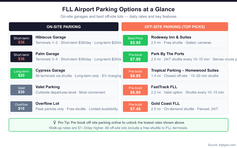 Pre-booking FLL parking online is the single best way to save money and guarantee a spot. Off-site lots booked through comparison platforms typically cost 20–40% less than drive-up rates at the same lot.