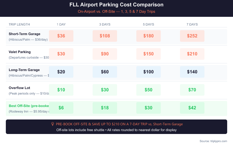 Fort Lauderdale airport parking costs $7.95–$36/day depending on option. Compare on-airport garages, the $10/day overflow lot, valet at $30/day, and off-site lots with free shuttles.