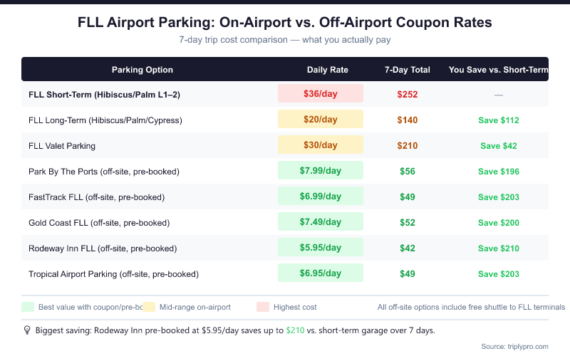 - Savings range: Off-airport coupon rates start at $7.95/day — up to 60% cheaper than FLL on-airport long-term parking at $20/day.