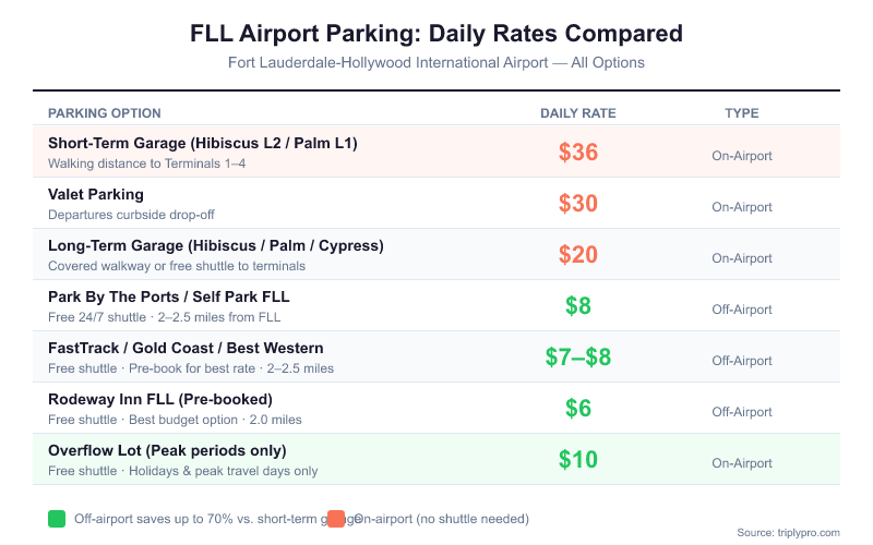 FLL daily parking rates vary widely depending on where you park. On-airport garages offer rates from $10 to $36 per day, while verified off-site lots near FLL charge between $7.95 and $9.99 per day (verified April 2026). Here is a full breakdown of every option side by side.