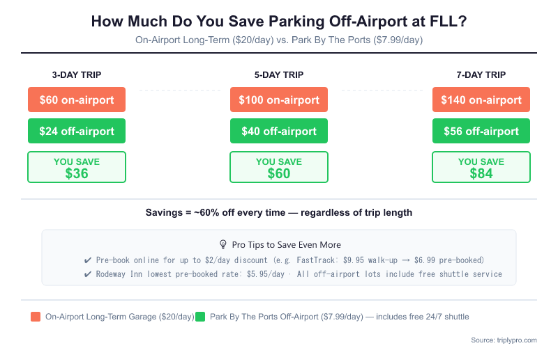 Off-site parking near FLL is consistently cheaper than on-airport garages. The table above shows the daily rates, but the real savings show up over multiple days. Here is a quick savings comparison for common trip lengths.